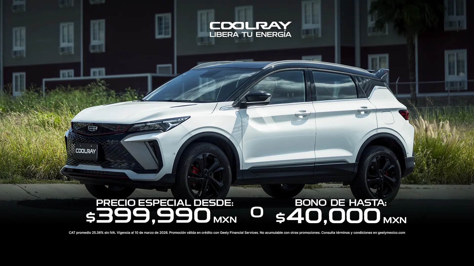 Precios de contado en Moneda Nacional (MXN) aplicables para Geely Coolray modelo 2026 en versiones GC, GL y GF, sujetos a disponibilidad, inventario y condiciones vigentes en la red de distribuidores Geely participantes. Los precios especiales en website reflejan la aplicación de un Bono Flexible de $40,000 MXN, resultando en precios desde $399,990 MXN para Coolray GC, $419,990 MXN para Coolray GL y $469,990 MXN para Coolray GF; precios sin Seguro Gratis incluido. No acumulable con otras promociones o beneficios financieros. Vigencia, términos y condiciones sujetos a cambios sin previo aviso. Consulta disponibilidad y condiciones con tu distribuidor Geely autorizado.