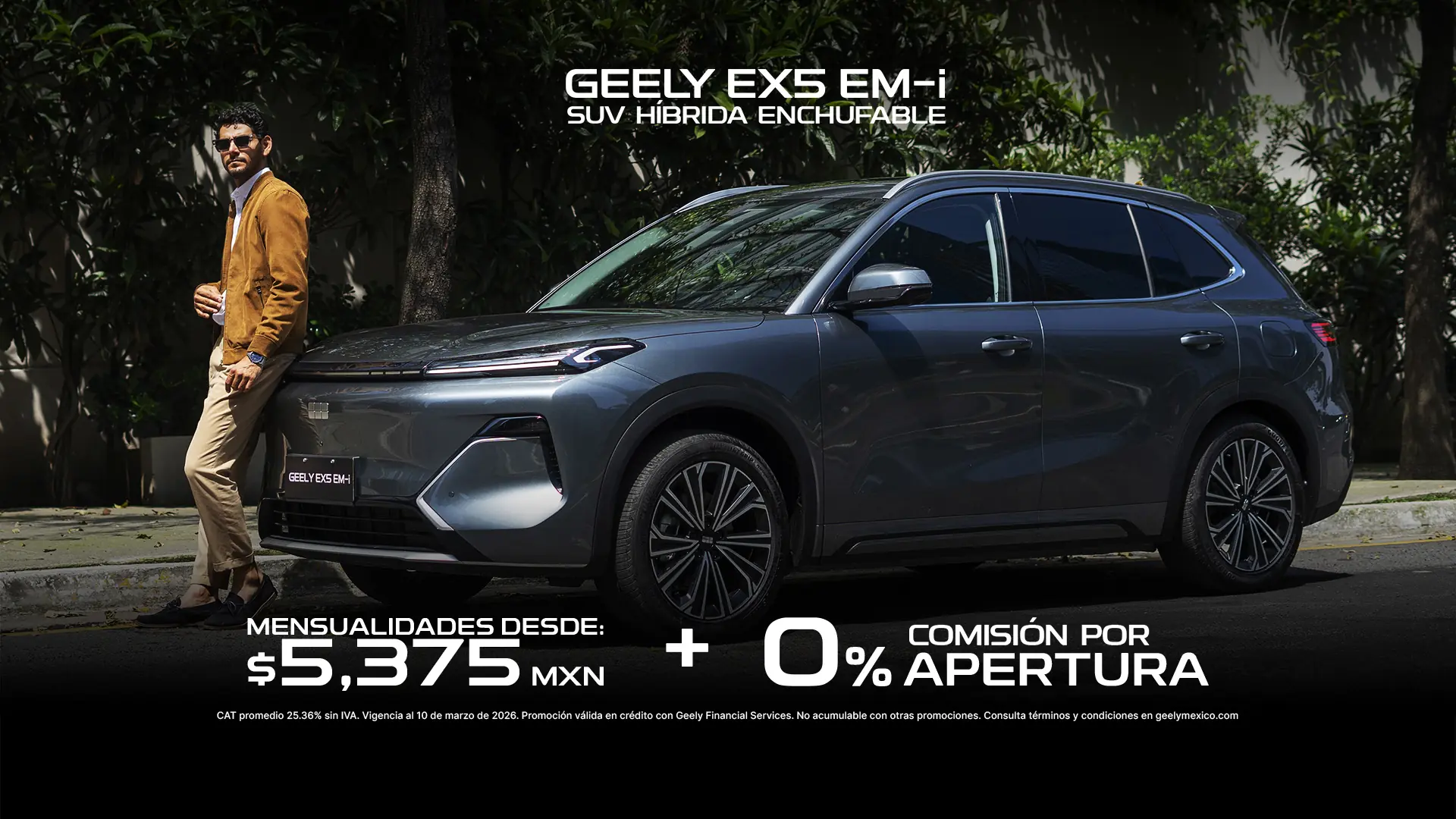 La mensualidad desde $5,375.00 MXN aplica únicamente con el plan de crédito simple, a través de Geely Financial Services (BBVA México S.A., Institución de Banca Múltiple), para el modelo EX5 EM-i 2026 en su versión GL, con un enganche desde 50 %, sobre un importe promedio a financiar de $264,995 MXN a un plazo promedio de 72 meses y tasa de interés ordinaria fija anual sin IVA del 10.49%. Esta oferta no incluye el costo del seguro, mismo que podrá ser cubierto de contado o financiado, conforme a lo estipulado en su contrato, y no es acumulable con otras promociones. Monto de la mensualidad publicada incluye IVA e impuestos. Aplica 0% de comisión por apertura usando plan LAN.