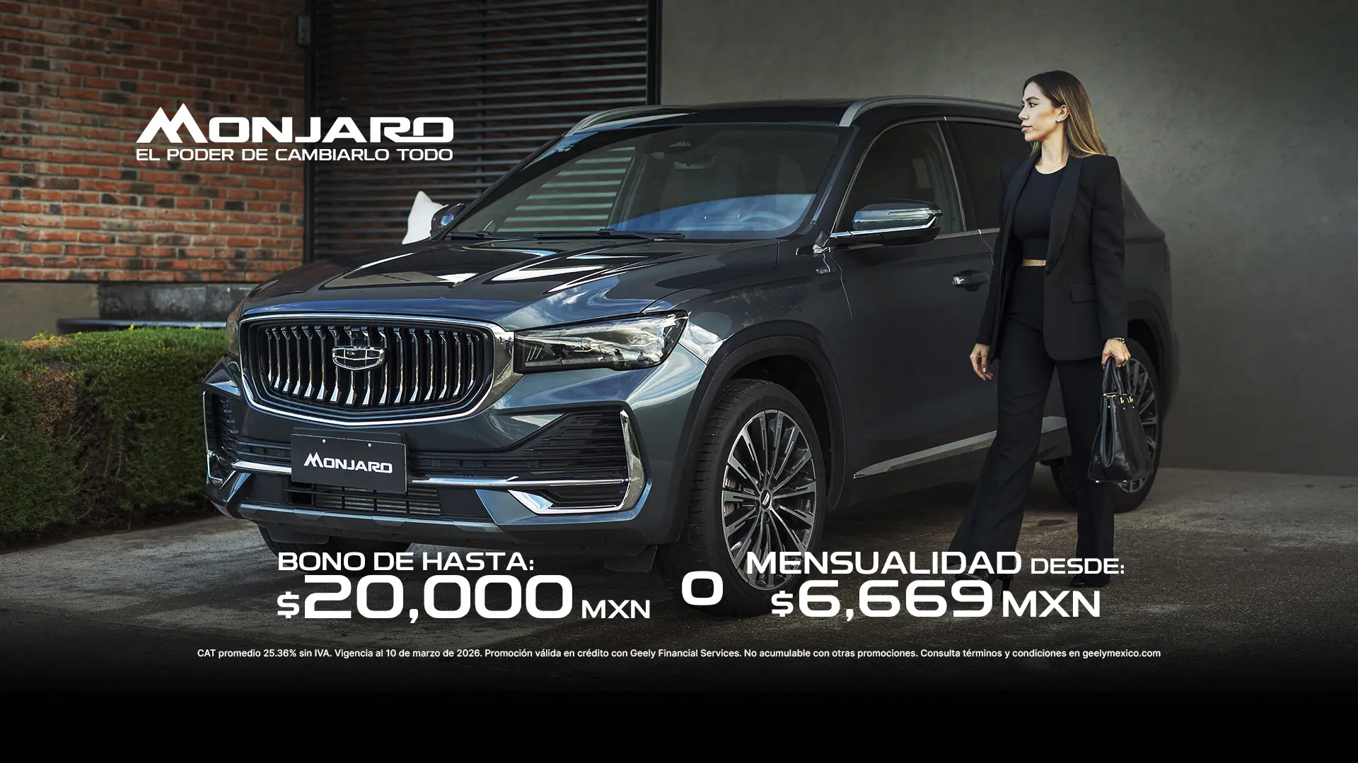 La mensualidad desde $6,669.00 MXN aplica únicamente con el plan de crédito simple, a través de Geely Financial Services (BBVA México S.A., Institución de Banca Múltiple), para el modelo Monjaro GF 2026 en su versión GF, con un enganche desde 51 %, sobre un importe promedio a financiar de $342,995.10 MXN a un plazo promedio de 72 meses y tasa de interés ordinaria fija anual sin IVA del 9.14% utilizando el bono flexible de $20,000 MXN sin Iva para Subsidio a Tasa. Esta oferta no incluye el costo del seguro, mismo que podrá ser cubierto de contado o financiado, conforme a lo estipulado en su contrato, y no es acumulable con otras promociones. Monto de la mensualidad publicada incluye IVA e impuestos. Aplica 2.5% de comisión por apertura en plan BASE.